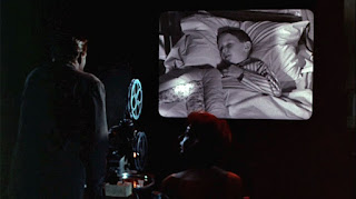 He almost shows her what he was looking at, the removal of the girl he murdered, but he decides not to be that open with her. He instead displays a film of himself as a child, which his father, a scientist, took. The implication is that his father was the influence on Mark’s interest in photography, which is confirmed when there is a scene of his father giving him a camera, the one he still has. The home movie shows how his father experimented on him to see his reaction to fear. He would shine a bright light into young Mark’s eyes which caused him to cry. He dropped a lizard in his bed to frighten him. He also filmed the child looking at two lovers kissing and embracing in the park. He also documented Mark’s reaction to his dead mother and her burial. Helen is obviously upset by these images. Mark now wants to record Helen as she looks at the home movie. His father taught Mark to live life through observing and recording people in distress, and it’s as if Mark is continuing his parent’s scientific studies. Director Powell’s camera shows Mark looking through the turning reel of the film, stressing how he is tied to seeing life through the camera.